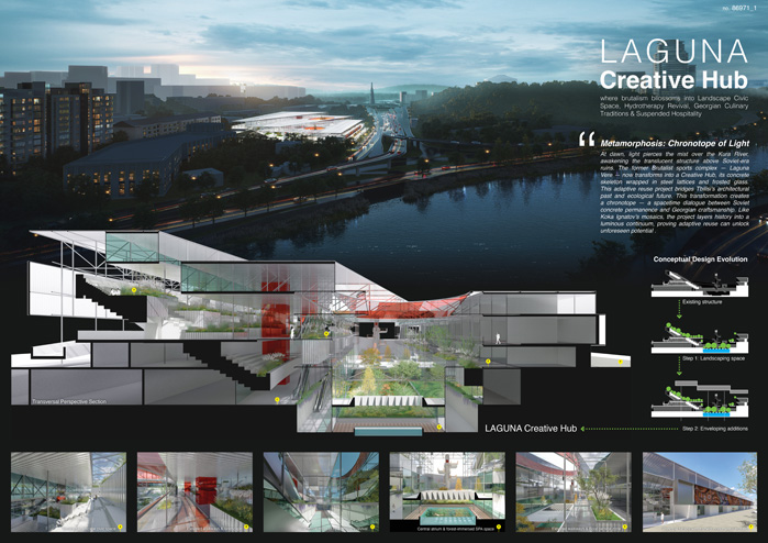 At dawn, light pierces the mist over the Kura River, awakening the translucent structure above Soviet-era ruins. The former Brutalist sports complex — Laguna Vere — now transforms into a Creative Hub, its concrete skeleton wrapped in steel lattices and frosted glass. This adaptive reuse project bridges Tbilisi’s architectural past and ecological future.”
