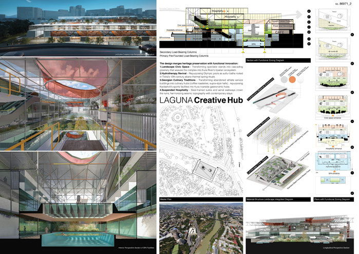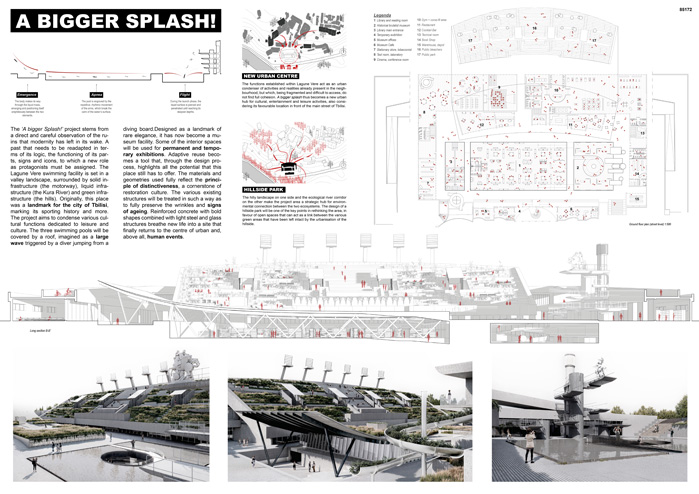 Laguna Vere, a massive Soviet-era swimming complex inside Tbilisi, now exists as a vast void, a crumbling material structure, socially isolated but dense in memory and desolate. The site is handled by this proposal as ground enabling critical reuse. It also sees it as a place toward spatial transformation rather than nostalgic restoration or glossy redevelopment. Modular architecture guides the project using adaptive reuse with a conceptual axis, the Line of Memory, which reactivates the pools as spaces of collective reflection, movement, and renewal.