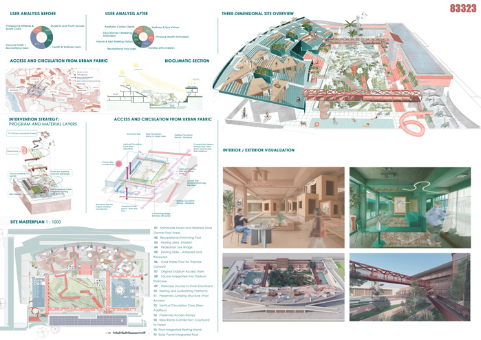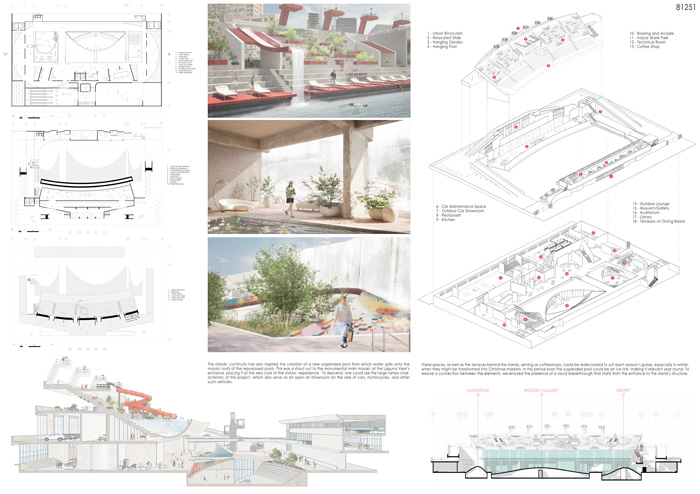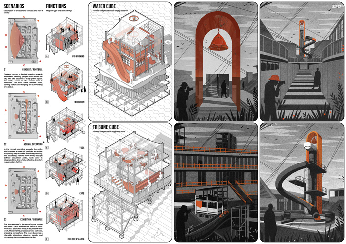 The modular units can accommodate a diverse public program for all. This involves stages, yoga spaces, winter gardens, exhibit areas, play areas, and food areas. For drained pools, floating platforms were developed. Tribune-integrated cubes fixed onto the stadium seating were developed too. Minimal intervention defines both of the systems just as it does steel-frame logic. Assembly using bolts permits reversibility. Through rest, circulation, and open-air activity, the stepped tribunes are reactivated as a green landscape.