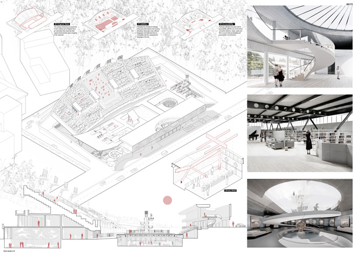 Respecting the original structure: The robust concrete frame and monumental scale of the building are preserved and celebrated. Opening the building to the city: The south-facing public functions—exhibition areas, lecture halls, and a food court—extend into the park, creating a civic interface.