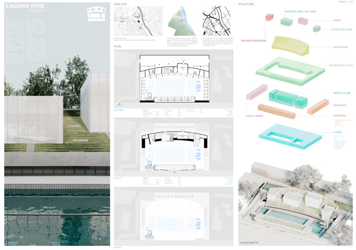 The competition invited participants to envision a new future for the iconic complex “Laguna Vere”, encouraging a multifunctional approach open to diverse interpretations. From wellness retreats to cultural hubs, from sports complexes to educational campuses, the competition allowed for boundless creativity, welcoming both subtle and transformative interventions. At the same time, a strong emphasis was placed on preserving the building’s original architectural and artistic features, ensuring that any proposal would respect its unique identity while unlocking its potential for contemporary use.