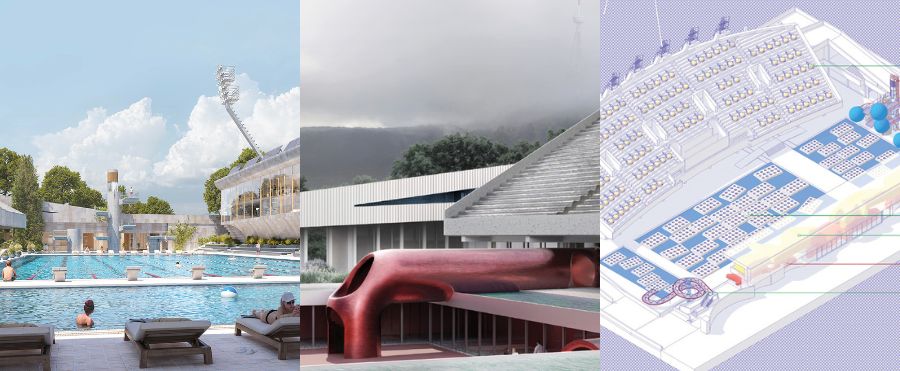 At its core, the sports complex pairs a field of action with a field of view – the water pool and the amphiteather. Laguna Vere complex was structured by two dominant elements: the diving tower and the monumental grandstand. Complementary, the image of the water slide adds the ludic component to this brutalist frame. Our main proposal aims to challange the typical stage-audience duality, enabling positions to shift and overlap and reframes the whole as a graduated field of functional zones calibrated by intimacy, noise level, and time of day.